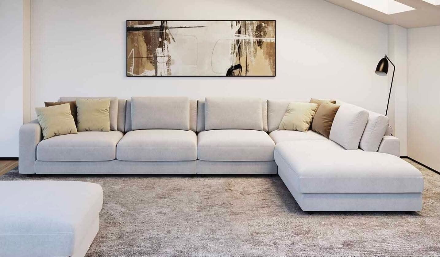 This style of sofa offers a contemporary aesthetic with clean lines, soft-textured fabric upholstery, and plush, deep cushions designed for comfort. Many similar models are modular, allowing for flexible configuration in a living space.